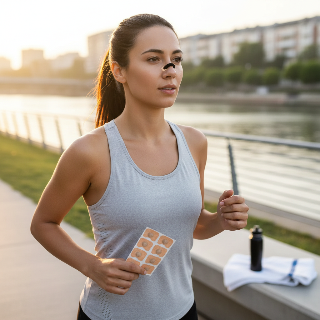 Posiciona el clip en el tabique o adhiere la tira sobre el puente nasal de forma firme y cómoda.